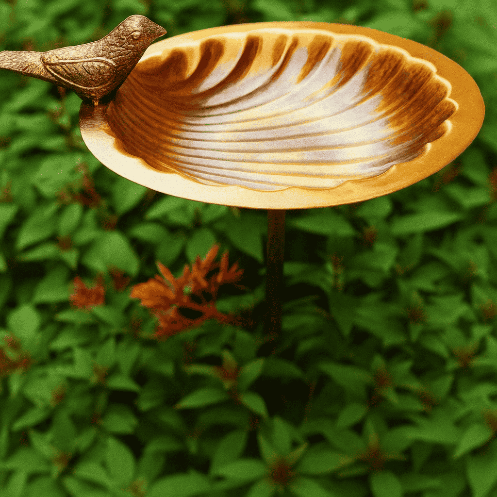 Whimsical Bird Design: This bird bath features a charming shell-shaped bowl with a detailed bird perched on the rim. The vintage-inspired brushed gold finish adds a timeless and elegant touch to any garden or patio.