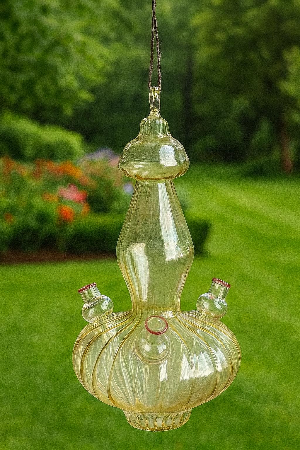 Artistic Hummingbird Feeder: This beautiful glass hummingbird feeder features a unique, sculptural design in a vibrant yellow color. Its elegant shape and delicate details make it a stunning piece of garden art.