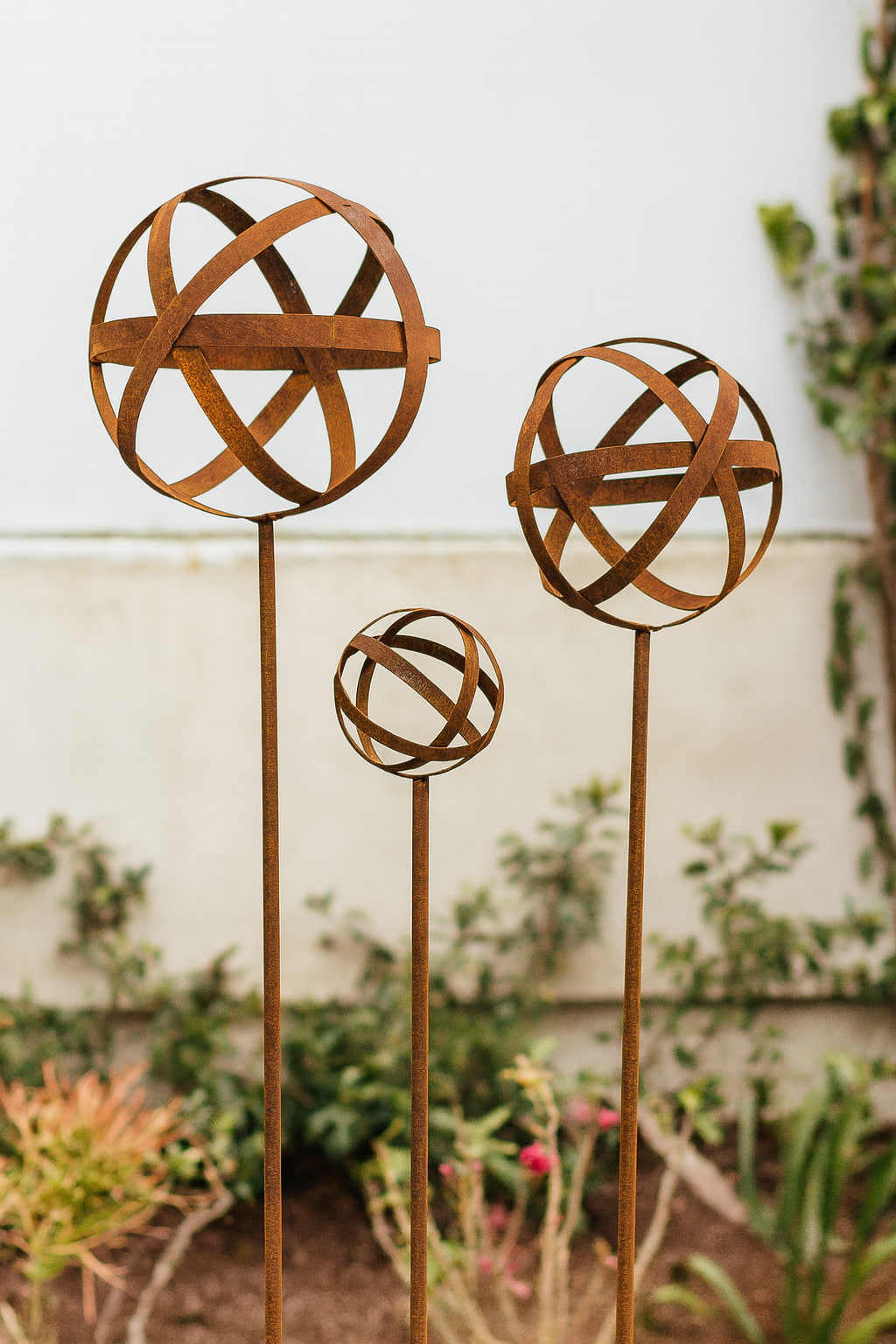 Set of Three Sculptures: A tiered set of three orb sculptures that adds a sense of rhythm and varying height to your garden’s design.