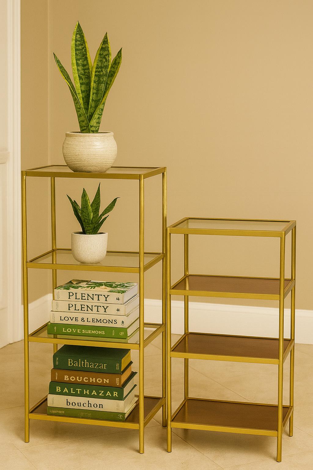 • Modern & Minimalist Aesthetic: With a sleek gold metal frame and clear tempered glass shelves, these units add a touch of modern sophistication to any living space. The clean lines and open design create an airy, uncluttered feel.