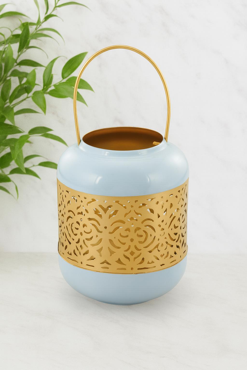• Chic Two-Tone Design: This lantern features a beautiful pale blue finish contrasted with a gold laser-cut center band, creating a unique and sophisticated look that adds a splash of color and elegance to any setting.