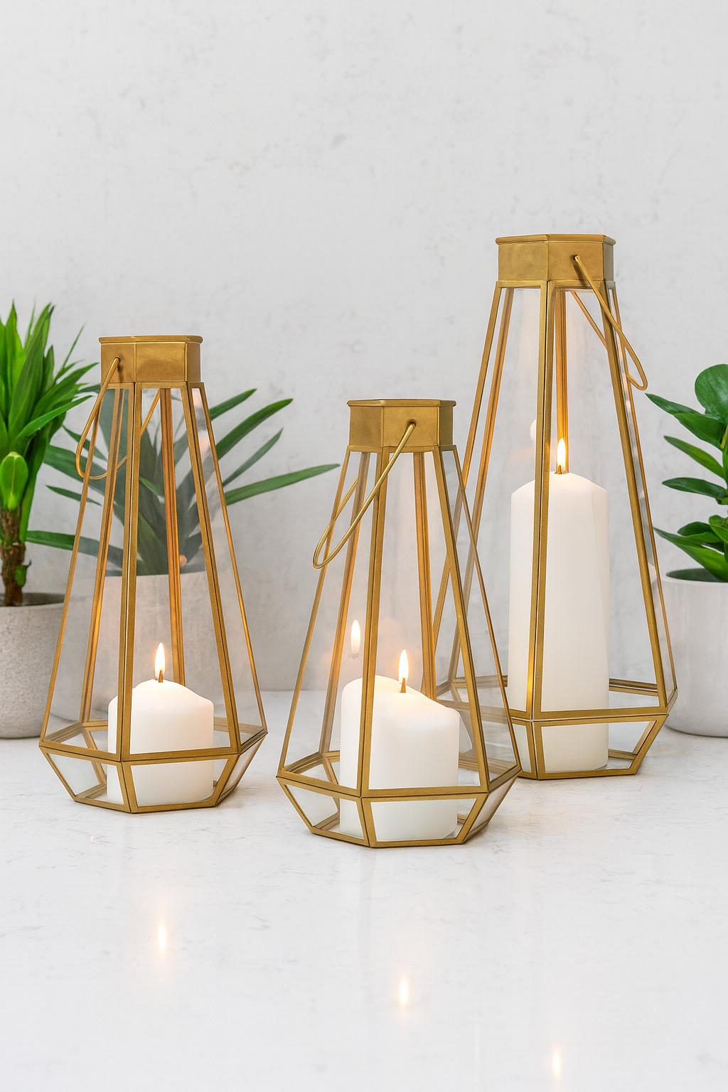 Geometric Elegance: This three-piece set of lanterns features a striking geometric design with a clean, gold metal frame and clear glass panels, creating a modern and sophisticated look.