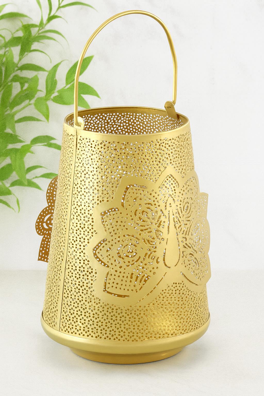 Intricate Lotus Design: This lantern features a beautiful matte gold finish with an exquisite lotus flower design. The detailed cutouts add a touch of spiritual elegance and artistic craftsmanship to any setting.