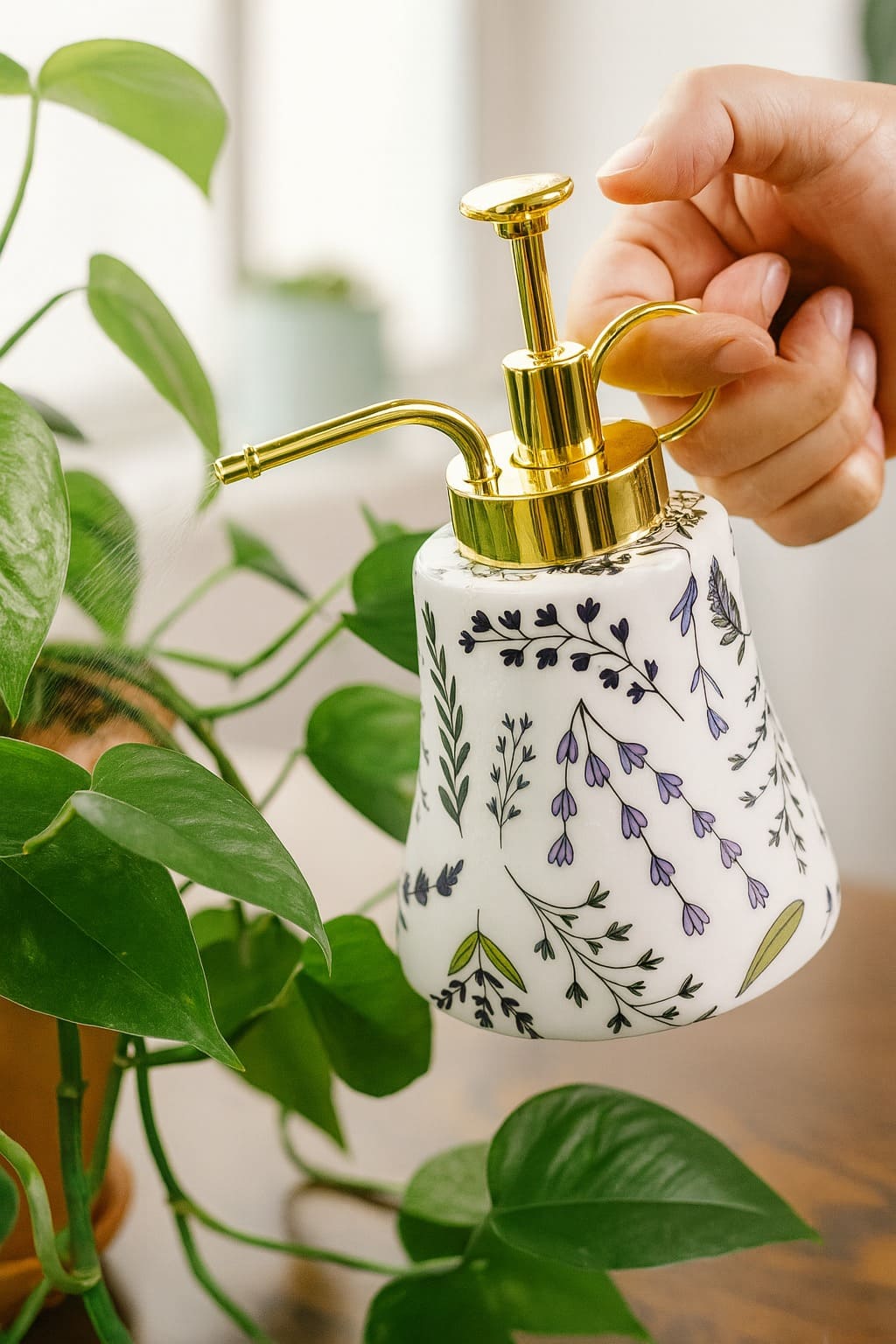 Elegant Floral Design: This mist pump features a beautiful ceramic body with a delicate floral and leaf pattern, topped with a sleek gold-toned pump. Its charming design adds a touch of classic elegance to your plant care routine.