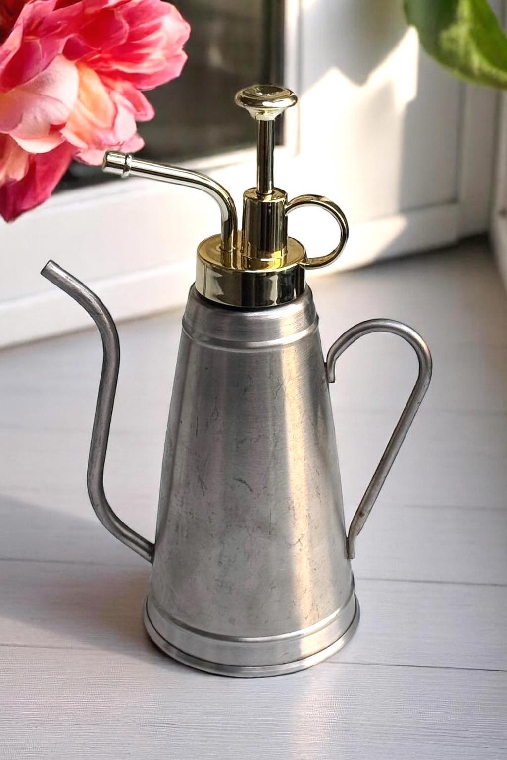 • Vintage & Industrial Design: This mister and watering can combination features a timeless, vintage-inspired design with a brushed silver body and a striking gold pump top, adding a touch of industrial chic to your plant care routine.