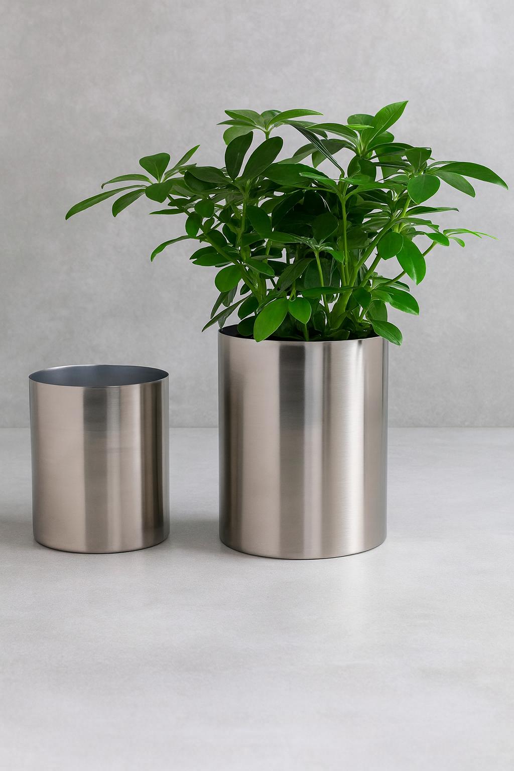 • Sleek and Minimalist Design: This set of two planters features a clean, cylindrical shape and a modern silver finish that effortlessly complements any decor.