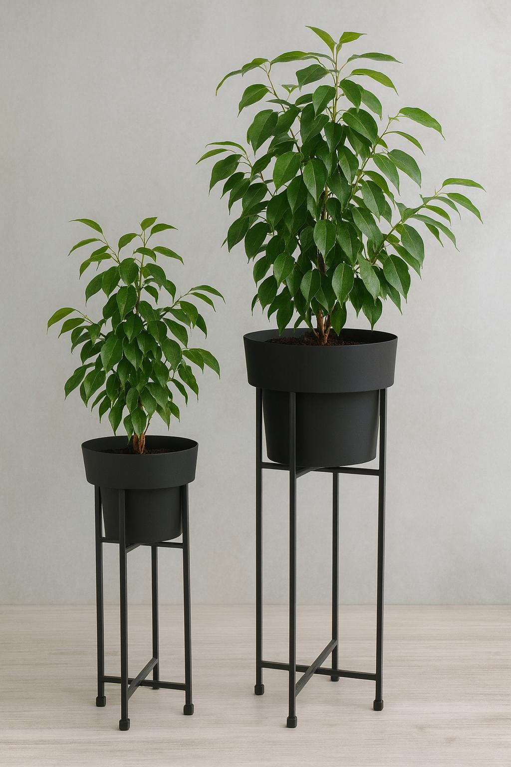 Sleek and Modern Design: This set of two planters features a clean, matte black finish and a minimalist stand, making your plants the focal point of the room.