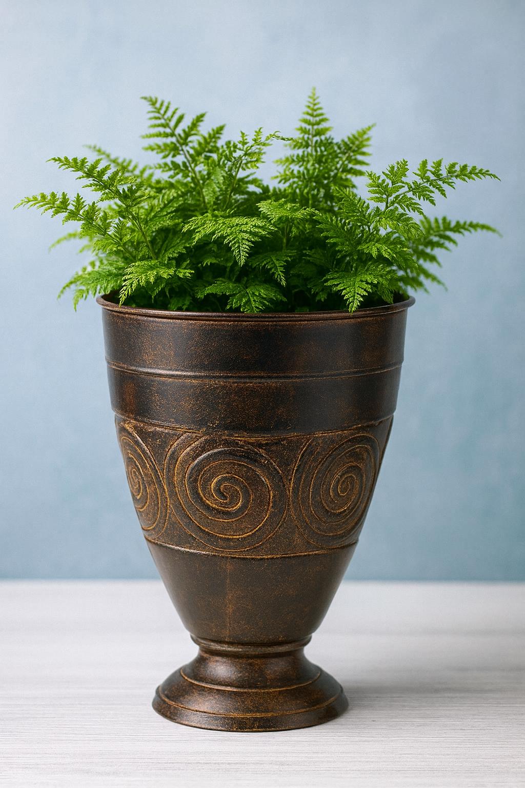 Old-World Charm: This planter features a distressed bronze finish and an intricate spiral pattern, adding a touch of vintage-inspired elegance to any space.